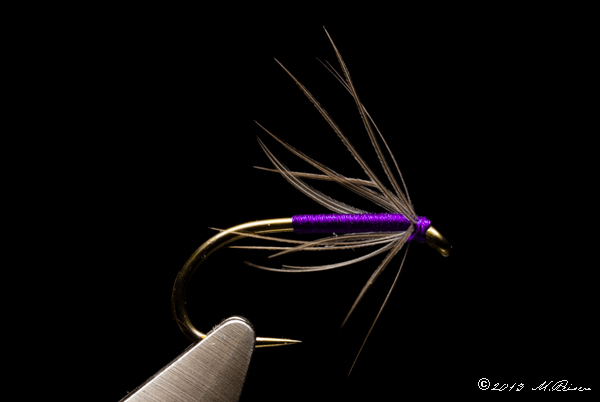 gebunden von Ralph Hertling Der Haken war ein Tiemco TMC2499 SPBL. Als Garn kam natürlich Pearsall's Gossamer in Purple zum Einsatz. Gleich hinterm Öhr wurde die erste Wicklung in touching Turns bis zum nicht vorhandenen, aber gedachten Widerhaken geführt. Dann kam ganz simpel zurückwindend ein Tag. Ein ganz fluffiger Körper mit frisch gezupftem und angedubbten Maulwurf wurde weiter zurückwindend angewunden bis einen Milimeter zurück kurz vors Öhr. Eine ebenso frisch gerupfte Coq de Léon- Hennenhechel wurde auf der in Drehrichtung korrekten |