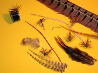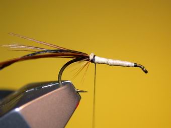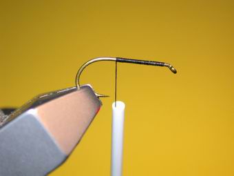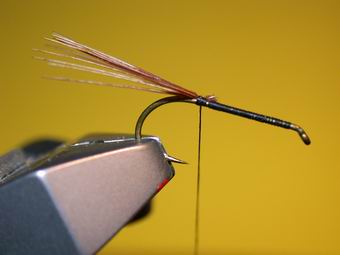 | Als Haken verwende ich hier einen TMC 100 # 10. Als erstes legen wir eine Grundwicklung. Etwas Lack auftragen kann nicht schaden. | Einbinden der Fasanenstoßfibern als Schwänzchen. |