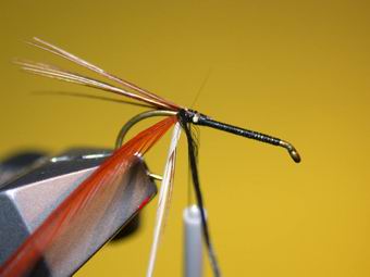 | Direkt hinter dem Öhr wird nun die Rebhuhnhechel fixiert und ein bis zweimal um den Haken geführt und abgebunden. | Jetzt bleibt nur noch der Kopfknoten, ein bißchen Lack darauf und fertig ist die Panama. Auch von hinten macht sie keine schlechte Figur. |