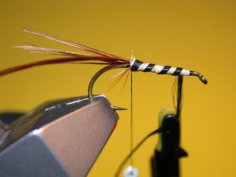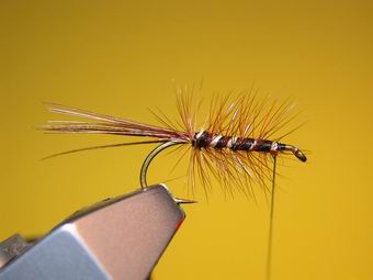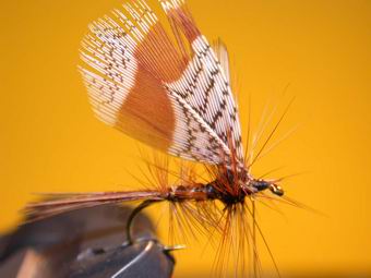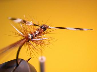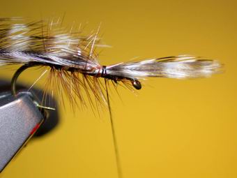 | Durch Kreuzwicklung werden die Flügel in Stellung gebracht. So sollten nun die "Spent-Flügel" abstehen. | Das gleiche machen wir jetzt mit den braunen aufrechtstehenden Hechelspitzen. Mit dem Bindefaden werden ein paar Wicklungen vor den Hechelspitzen gelegt, sodass sie sich besser aufrichten. |