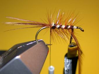 | Festlegen der großen Brusthechel. Zwei bis drei Wicklungen vor und hinter den stehenden Hechelspitzen dürften ausreichen. | Der Faden wird nun vorsichtig durch die Hecheln nach vorne geführt und diese festgelegt. Ein Halbschlag sichert die bisherige Arbeit. Ein Blick von hinten auf die fast fertige Fliege. |