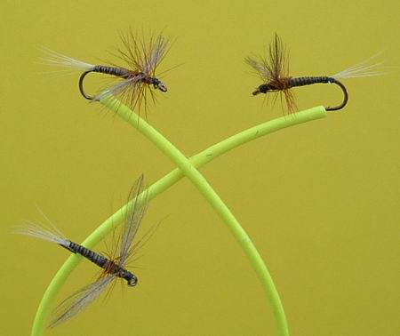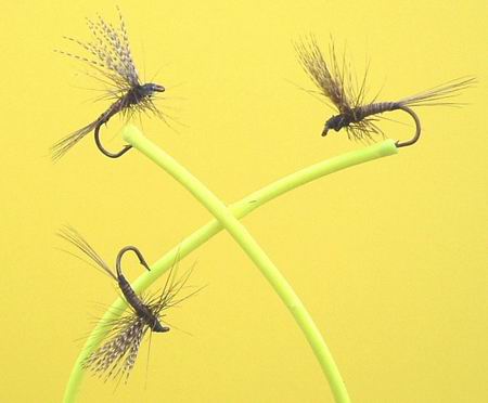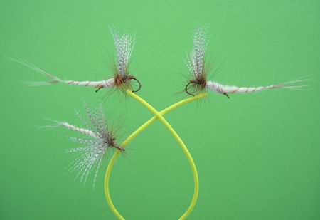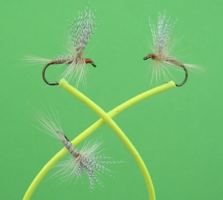 Trockene Äschenfliege Haken Nr. 16, 18, 21 Weiße Hechel. Dunkelbrauner Körper ; weiße Schwanzfäden. Bewährt beim Schlüpfen von Caenis; besonders für Spätnachmittag und die Dämmerung gedacht. |