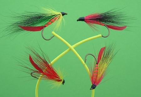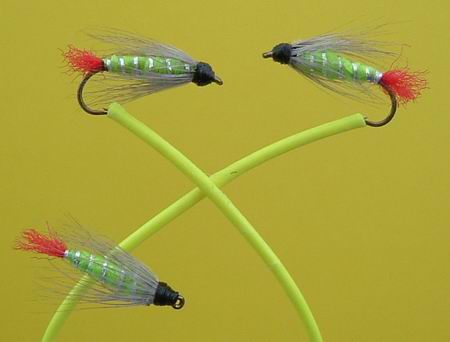 Typus D Ritz Haken Nr. 15, 14, 13 Goldgeringelter Körper aus Pfauenfederfahne. Der Golddraht dient als Beschwerung. Haken Nr. 15, 14, 13 |
