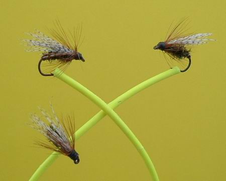 Spanische Hechelbindung: lange, spärliche Hechel am Körper schräg nach hinten anliegend. Tief naß fischen, wie Holzwurm; sehr gut in Berggewässern |