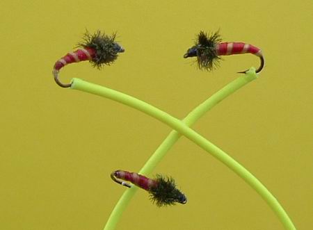 Typus C Traun Haken Nr. 14, 13, 12 Körper aus roter Seide, gelbgeringelt. Beschwerung mit ganz dünnen Kupferdraht. |