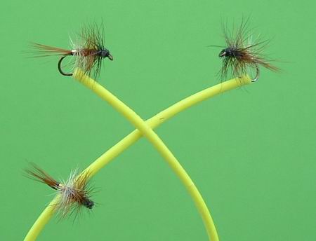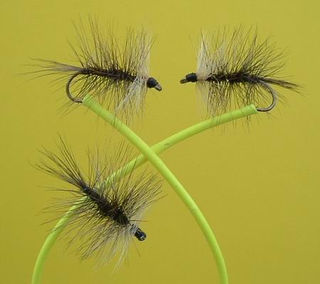 Trockenfliege Haken Nr. 14, 16, 18 Hechelfliege aus drei bis zum Bogen gewundenen, dicht hintereinander stehenden Hecheln, schwarz, rotbraun, aschgrau, mit Körperende aus Goldlametta. Sehr gut sichtbar! Schwimmt sehr hoch. Unentbehrlich... |