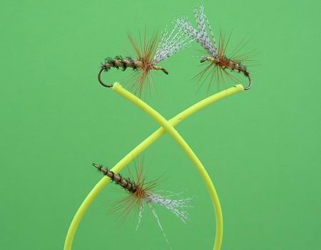 mit Hechelflügeln und weichem Plastik-Leib; Trockenfliege Haken Nr. 10, 12, 14 |
