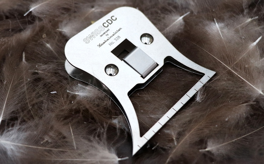 Die moderne Materialklemme ist komplett aus hochfestem, nicht rostendem Stahl gefertigt. Die Oberfläche ist blendfrei oberflächenbehandelt, das Design ist sehr modern und auf Funktionalität getrimmt. Der Klemmbereich ist offen gehalten, um das eingeklemmte Material mit Daumen und Zeigefinger mit Leichtigkeit und ohne zusätzliches Werkzeug zu bündeln und zu bearbeiten. Mit der spitz designten Form der Klemmbacken ist es möglich, direkt ins Rehhaar zu fahren, um es über die gesamte Backenbreite in die Dubbingschlaufe zu nehmen, auch in größeren Mengen. Auch künstliches Material wie z.B. Craft Fur kann direkt mit der Multiclamp aus der Matte in die Klemme aufgenommen werden. Somit ist nicht nur die traditionelle Verarbeitung von CDC mit der Multiclamp gegeben. Es werden auch Fliegenbinder damit angesprochen, die zum Binden von Streamern viel künstliches Material in die Schlaufe bringen müssen. An den Präzisions- Klemmbacken ist per Laser in einer 5 mm Einteilung ein Lineal aufgebracht, damit das Material immer in der gleichen Menge eingebunden werden kann. Einen weiteren Vorteil bringt die Multiclamp beim Verarbeiten von den gröberen Swiss CDC Haar- und anderen Haar-Dubbings. Die Haare können, bedingt durch den kleinen Radius an den Klemmkanten, direkt lose vom Bindetisch aufgenommen und dann in die Dubbingschlaufe gebracht werden. Auch das Fassen und Bündeln von CDC-Federn für Flügel etc. gestaltet sich sehr praktisch. Mit der Multiclamp bekommt der Fliegenbinder ein nicht alltägliches, multifunktionales Werkzeug in höchster Schweizer Qualität in die Hand. |