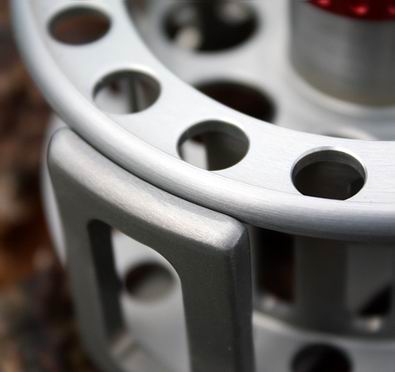 | Beschreibung und Praxistest: Stabile Großkern-Fliegenrolle aus hochqualitativen und sehr harten T-7075 Aluminium, aus dem vollen Block gedreht und gefräst, 100% salzwasserfest vergütet und mit fein einstellbarer Multischeibenbremse. Ansprechendes, modernes Design und unauffällige, reflexionsarme Farbe. Sehr hohe Kratzfestigkeit durch eine spezielle Hart- Coatierung. Die Spule läuft auf einer starken Edelstahlachse im offenen, minimalistischen Rollenrahmen, unter sehr guter Gehäuseplatzausnutzung, mit einer weitgehend offenen Gehäuserückseite. Der Rahmen besitzt zwei seitliche Stege: einen breiteren Steg hinten, an dem sich der zweifach von Außen geschraubte Rollenfuß befindet und einen schmaleren, gelochten Steg vorne mittig für die Schnurführung. Im Gegensatz zu vielen anderen Fliegenrollen greifen die Stege nicht in eine Nut auf der Spuleninnenseite, sondern überragen die Spulenaußenseite ein wenig. Ein ungewolltes Durchrutschen von Schnur, Vorfach oder Backing kommt aufgrund der absolut minimal gehaltenen Abstände kaum vor. | ![]() |