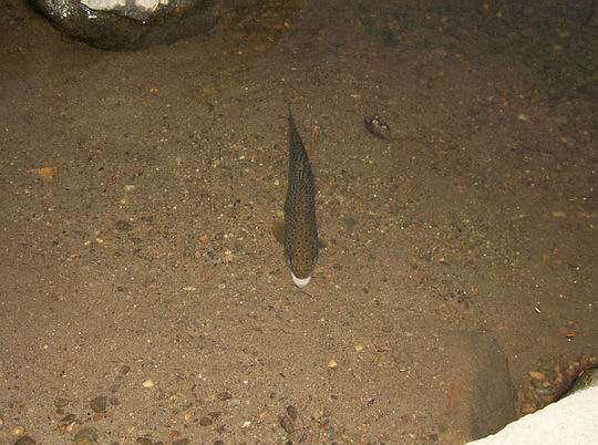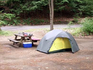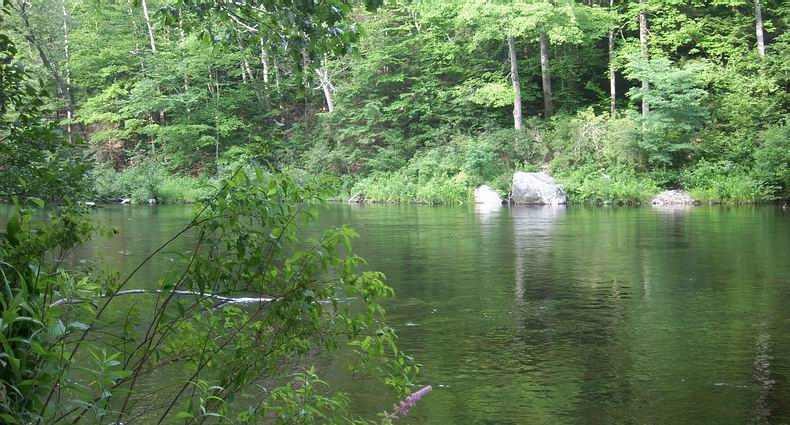 Nach dem Erlangen der Fishing License (gibt‘s für $40.00 pro Jahr für Auswärtige im Townhouse, also Rathaus. Der Angelladen „Anglers Valley“ in Dunbury hatte nur noch Tageskarten) und der Lebensmittelbeschaffung, ging's für 3 Tage in den Housatonic Meadows State Park. Dieser wunderschön gelegene Campground liegt direkt am Ufer des Housatonic River (siehe Foto rechts). Nachdem mich meine Frau abgesetzt hat und das Nachtlager erstellt wurde, ging es gleich mit der 5er Rute ans Wasser. Als ziemlich nützlich erwiesen hat sich ein Watstock aus dem angrenzenden Wald. Der Housatonic hatte einen sehr niedrigen Wasserstand erreicht, nachdem der |