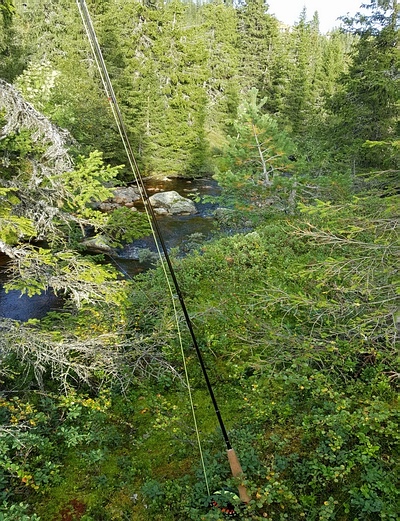 Nun stand ich aber hier in Norwegen, mutterseelenallein, am ersten mir nach dem Luftbild ausgewählten Bergbach und mit meiner schönen 5er Hardy. |