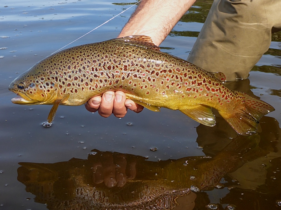 Das Aufsetzen der Trockenfliege wurde mit einem beinahe unscheinbaren Schwall belohnt. Wie aus dem Nichts stiegen beachtliche Bachforellen auf meine Fliegen und diese verschwanden in ihren großen, weiß schimmernden Rachen. Die Vollendung eines perfekten Tages, ging es mir durch den Kopf. Nach