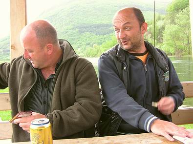 Regen, Wind und weniger Forellen, aber jeder hat was. Ein Gewitter mit Sturmböen zieht herauf. Auf der Terrasse fliegen die Stühle und Sonnenschirme um (siehe rechts), keinen kümmert es. So ist die Einstellung hier: Warum soll man das Zeug aufräumen, wenn es der Wind eh gleich wieder umhauen würde. Am Kiosk gegenüber kehren wir ein, weil unter Dach. Zeljko probiert mal meine Rute. Die Schnur fliegt bis zum Backing raus. Dann zeigt er mir den Switchcast, aber meine Fliege landet doch hinter mir im Baum. Rainer hatte ein Loch in der Wathose, darum heute die Watstiefel an. Er geht aber ins Wasser, und denkt nicht mehr daran, bis er die richtige Tiefe erreicht hat. Dann wird es plötzlich kalt. Mit nassem, kaltem rechten Bein wartet er frierend auf Markus. Der nutzt den Abendsprung bis zur Dunkelheit und fängt noch schöne Forellen. Als wir gerade ins Haus zurückkommen, kommt noch um 10:00 Uhr Besuch daher. Das ist Bosnien... |