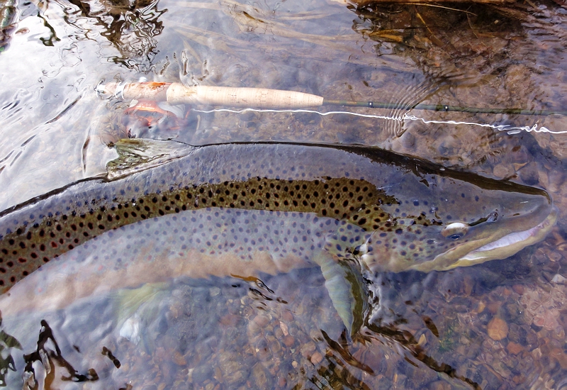 Eigentlich wollte Vereinschef Michael nur mal eben im Spätherbst ein Stündchen nach den Äschen schauen, dementsprechend war auch die mitgeführte Ausrüstung ausgelegt: ein sieben Fuß Rütchen Klasse #4. Die Überraschung war groß, als diese urgewaltige und außerordentlich gut konstituierte Bachforelle mit 70 cm Länge und geschätzen 4 bis 4,5 Kilogramm Gewicht am Haken hing... Ein Ausnahmefisch, wie er auch in besonders gehegten Revieren wie unserer Ilmstrecke nicht alle Jahre gefangen wird! Da bereits Schonzeit für Forellen war, blieb der große Milchner im Wasser und wurde nach ein paar raschen Fotos ohne wenn und aber - jedoch mit den besten Wünschen einer Wiederbegegnung in der nächsten Saison - rasch wieder freigelassen.