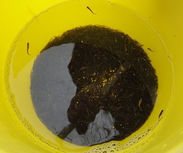 Die fischereiliche Hegearbeit wurde konsequent fortgeführt. Besondere Aufgabe des Vereins ist der Aufbau und die Pflege eines für die Ilm arttypischen heimischen Fischbestandes. Hierzu gehören neben dem Besatz von Ilm und Schwarza mit Bachforelleneiern und -Brut sowie mit Jung-Äschen und Kleinfischen anderer Arten auch diverse Pflege- und Aufräumarbeiten am Ufer und im Gewässer. Gewusel: Empfindliche Bachforellenbrut, aus dem Eimer in den Bach... Besatz der Ilm mit Bachforellenbrut am 20.02.2013: Wieder einmal machten der Winter und erhöhte Wasserstände einen dicken Strich durch unser alljährliches WV-Brutboxenprojekt mit Bachforelleneiern (siehe auch Chronik 2010). Also schlüpften unsere "Bachis" im Bruthaus und wurden von uns später als fressfähige Brut in geschützte Bereiche direkt in der Ilm in der Nähe der Laichplätze und Nebengewässern ausgesetzt - mit den besten Wünschen auf ein gutes Gedeihen! |