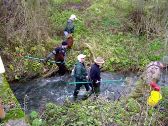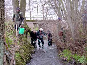 Wie in jedem Spätherbst wurde auch in diesem Jahr von Mitgliedern des Ilmtal-Fliegenfischer Vereins e.V. Bad Berka das elektrische Abfischen des Aufzuchtbaches "Schwarza" und das anschließende Umsetzen der ein- und zweijährigen Bachforellensetzlinge in das Pachtgewässer des Vereins, die Ilm, durchgeführt. Die "Schwarza" wurde vom Verein auf einer Länge von rd. 10 Kilometern eigens zu Aufzuchtszwecken angepachtet: Im Frühjahr wird mit Bachforellenbrut besetzt und im Herbst erfolgt das Umsetzen der herangewachsenen Fische in die Ilm. |