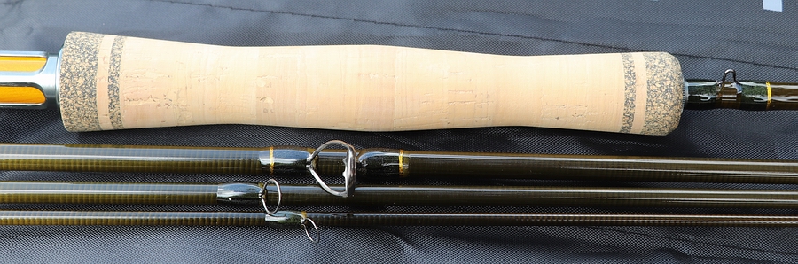 | Beringung: Hochwertige Beringung, bestehend aus einem Leitring mit Keramik-Einlage und leichtgewichtigen Einsteg-Ringen in dunkler Optik. Handteil mit einer feststehenden, kleinen Fliegeneinhängeöse über dem Griff, genau in Rollenflucht und ansonsten ohne weitere Beringung; 2.Teil mit einem Leitring und einem Einstegring; 3.Teil mit drei Einstegringen, Spitzenteil mit vier Einstegringen und dem Spitzenring. Die Ringdurchmesser und Materialstärken sind der Schnurklasse gut angepasst, die Ringe besitzen die nötigen Abstufungen. Die Ring- und Zierbindungen sind in Grün, etwas dunkler als Rutenfarbe und halbtransparent. Am Hand- und 2.Teil gibt es insgesamt 5 goldene Zierwicklungen. Alle Bindungen wurden gründlich bis reichlich lackiert und versiegelt. Dezente Beschriftung in Blassgold über dem Griff. |