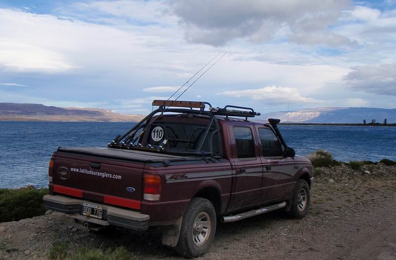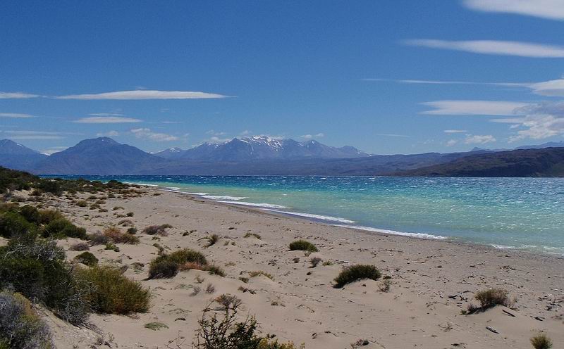 Der Pueyrredon erstreckt sich über eine Länge von beinahe 100 Kilometer, knapp die Hälfte des Sees befinden sich auf argentinischer Seite. Die Ufer des Sees sind beidseitig eingerahmt von schneebedeckten Gipfeln, felsige baumlose Steilufer wechseln sich ab mit grobkiesigen, hell leuchtenten Stränden und Steppenvegetation. 360 Tage des Jahres türmen die unaufhörlich blasende Westwinde hohe Wellen auf, die sich am Ostufer des Sees in einer atemberaubenden Brandung brechen. Windgeschützte Bereiche sind rar, aber es gibt sie. |