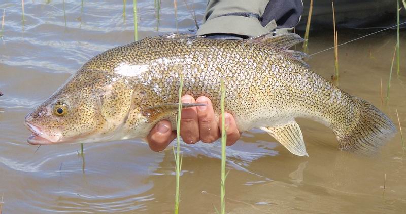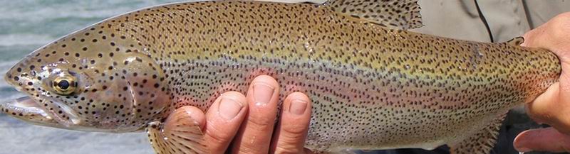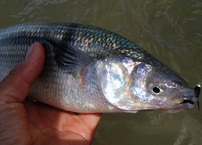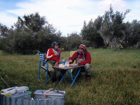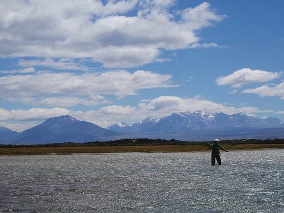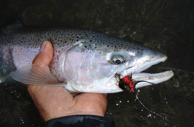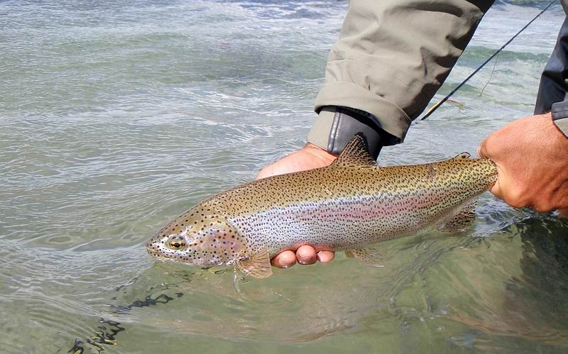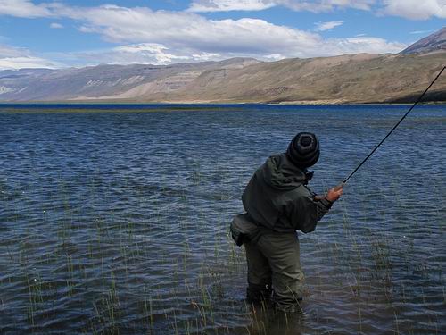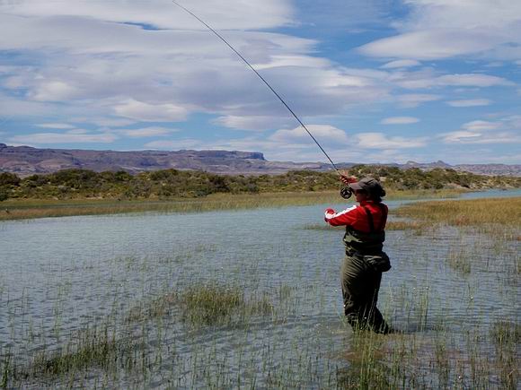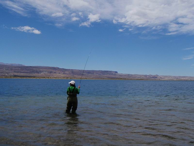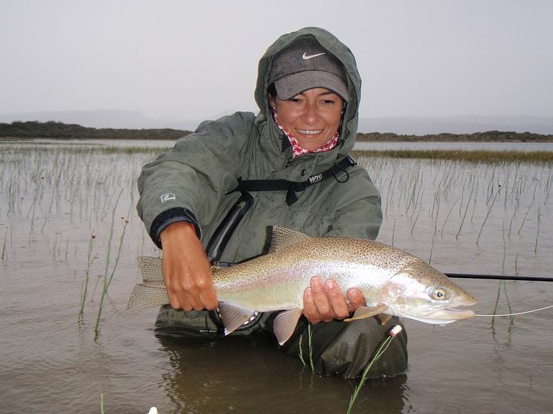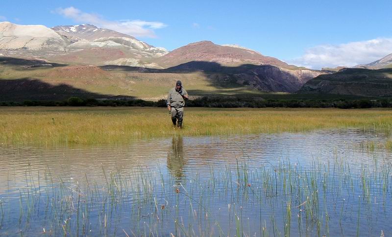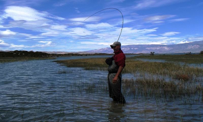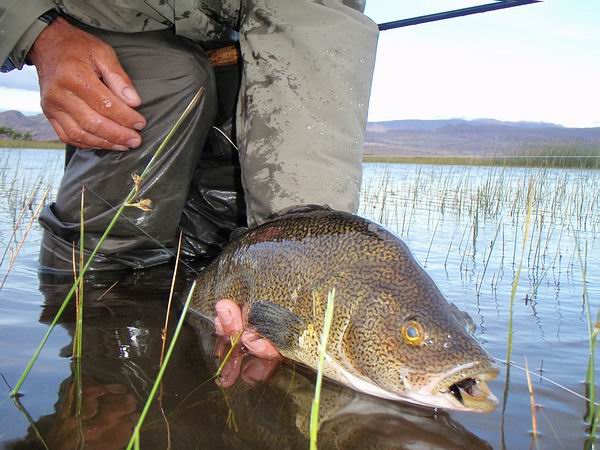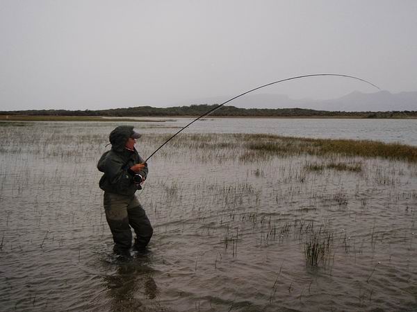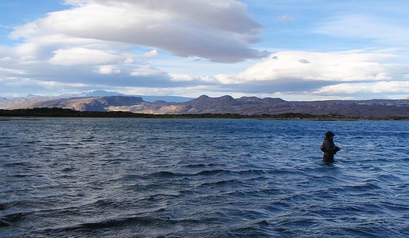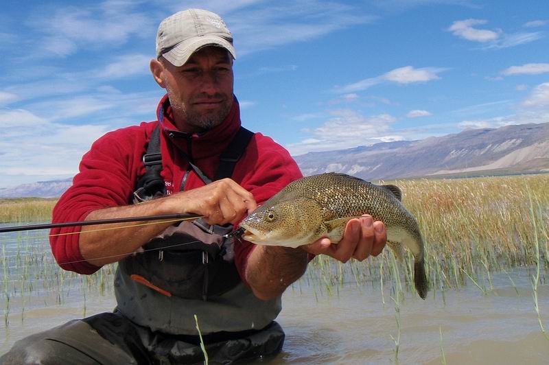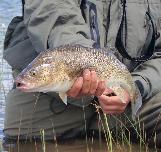 | Die Fliege, immer noch unser bewährtes dunkeles Muster tauchte im Bereich dieser Konturen ein, nach nur zwei langsamen stripes zog es ordentlich an meiner Schnur, diese schlanke Silhuette, ein Perca? Noch unwahrscheinlicher war eine Arco Iris hier in diesem Bereich. Ich staunte nicht schlecht, als dieser schimmernder Körper vor mir auftauchte: ein Pejerrey patagonico, Odontesthes hatcheri, hatte die Fliege genommen, er ist mit dem Perca eine weitere, nur hier im Süden vorkommende Art, und nimmt bereitwillig Nymphen und kleine Streamer. Einige der Pejerrey konnten wir noch überlisten, aber ungleich der Percas sind sie wesentlich scheuer und quitieren eine allzu unachtsamme Annäherung mit Misstrauen und Verschwinden. | ![]() |