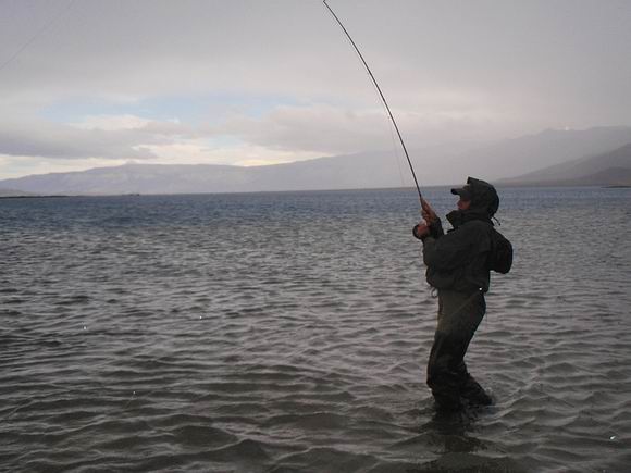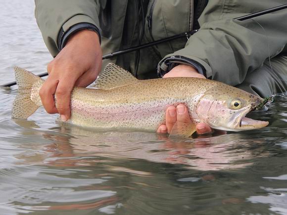 Nun, das Gelee war eingekocht, die Schichten von Fleece und Watjacke plus warmer Mütze angelegt, so machten wir uns wieder auf den Weg zum Wasser. Ich hatte meine #4 Rute gegen eine #5er eingetauscht und Carolina blieb bei ihrer 5er Gerte. Wir wählten nun einen anderen Bereich der Bucht, der Seeboden hier war firm und frei von lästigem Sediment. Wir hatten einen anderen Antagonisten ausgesucht: Die kampfstarken Regenbogenforellen, die Laichzeit war vorrüber und ungleich des Runs im nahegelegenem Fluss und der Leichtigkeit eine dieser Schönheiten zu haken, sind nun Ausdauer und Geduld gefragt, um diesen Fisch zu fangen. Aufgrund des Wasserstandes war die Distanz vom Ufer zum Steilabfall im See beträchtlich. |