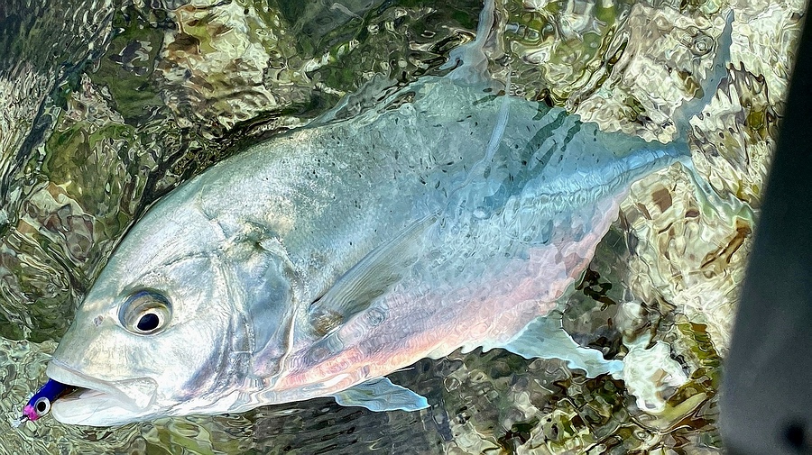 mit großen Salzwasserfliegen und Poppern auf Giant Trevally (GT)