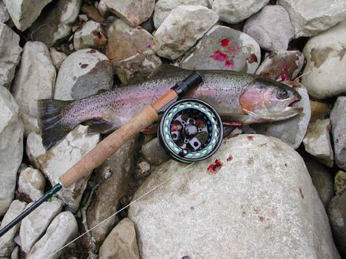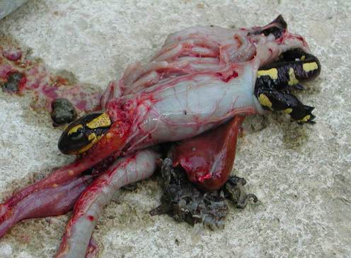Am 17. Mai 2006 war ich zum ersten Mal an der Wutach im Schwarzwald zum Fliegenfischen. Es war noch recht kalt und die Wutach führte noch zu viel Wasser. Aber trotzdem waren meine Nassfliegen "Realistics von Inselcrew" erfolgreich. Neben ein paar untermaßgen Bachforellen hatte ich einen ungewöichen Fang. Eine fast steife Regenbogenforelle mit 47 cm. Nachdem ich sie ausgenommen hatte, wollte ich unbedingt den Mageninhalt kontrollieren. Die Nahrungsvielfalt in der Wutach muss aber der Regenbogenforelle nicht ausgereicht haben. Deshalb entschied sie sich wohl für Feuersalamander mit 17 cm Länge (was schon eine Seltenheit ist). Anbei die Bilder dazu.
