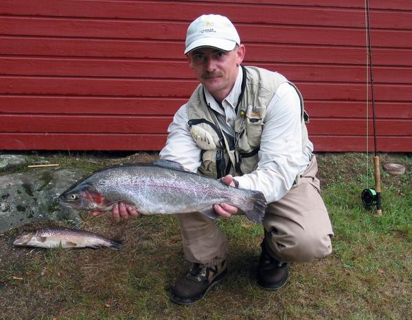 Eine richtig dicke Regenbogenforelle, gefangen in Harasjömala, Südschweden, im August 2006. Foto und Copyright: IK