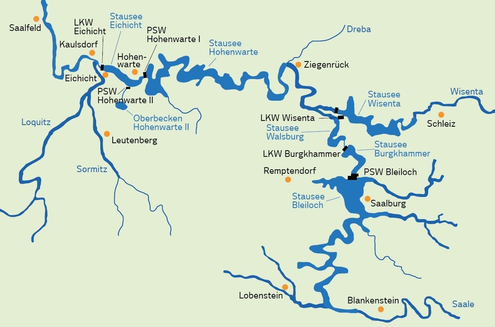 lange Saalekaskade setzt sich aus 5 Talsperren zusammen (siehe Karte oben),