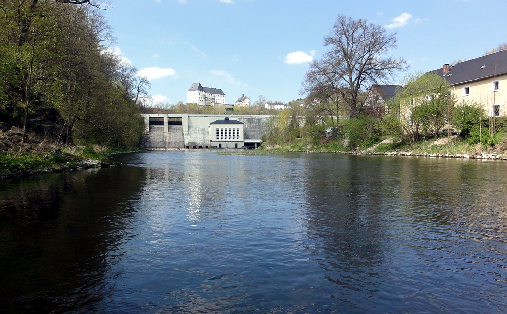 Unterhalb vom Stausee Burgkhammer in Burgk, der als Salmonidengewässer in der Saalekaskade-Angelerlaubnis des LAVT enthalten ist, beginnt die erste Fließstrecke der Saale, welche über 5,2 Kilometer bis zur Staumauer Walsburg reicht. Die Länge der Fließstrecke variiert übers Jahr, je nach Stauhöhe im Stausee Walsburg. Mit etwa 2 Kilometer kann man aber rechnen, bevor der Staubereich beginnt. Die Flußbreite reicht von 30 bis rd. 100 Meter. Landschaftlich ist die gewundene Strecke sehr reizvoll und völlig verkehrsberuhigt gelegen und über allem thront das hübsche Schloss Burgk. Die Strecke bietet Abwechslung und ist über Wanderwege gut beidseitig zu Fuß zu erlaufen. |