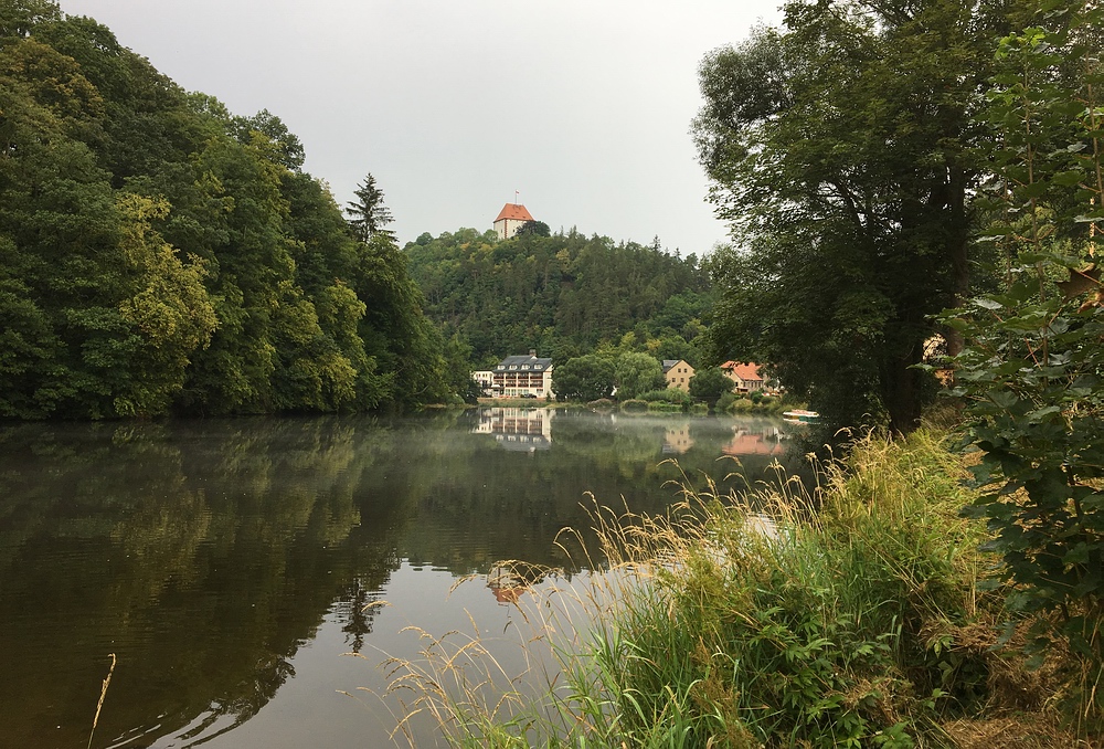 von Aussichtsturm Burgk auf den Stausee Burgkhammer mit Schloss Burgk,
