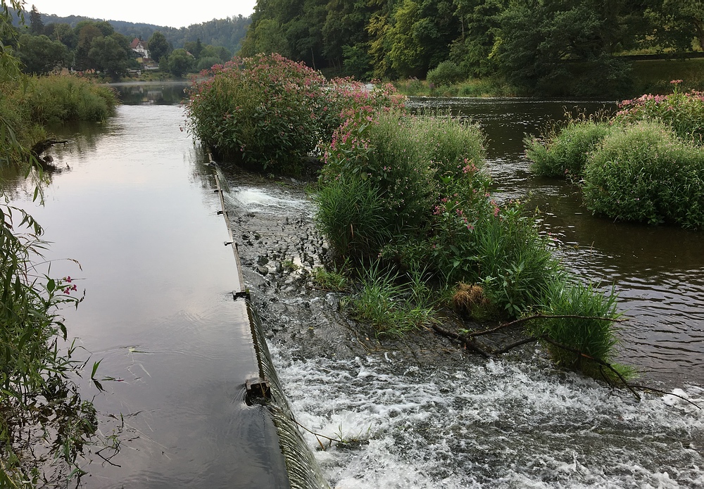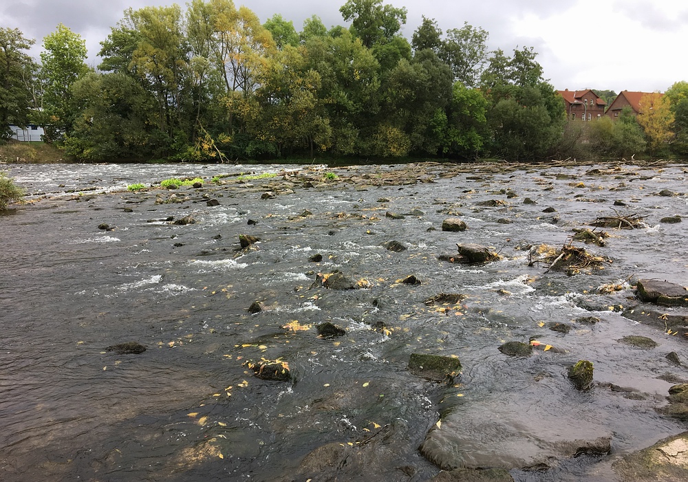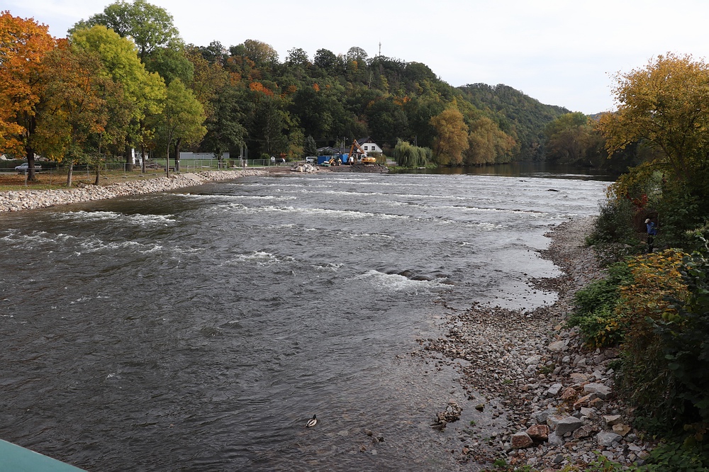 | Die Strecke beinhaltet auch mehrere Stauwehre mit Wasserkraftwerken und Ausleitungsstrecken. Während eines der Wehre (die Volkstedter Rampe) hier wie auch schon in Saalfeld vorbildlicherweise im Jahr 2020 zurück gebaut wurde, gibt es an anderen Stellen noch Handlungsbedarf. |