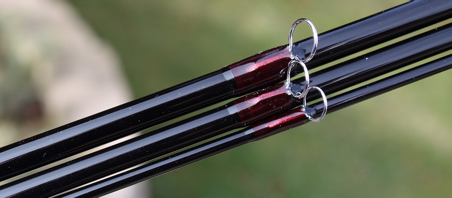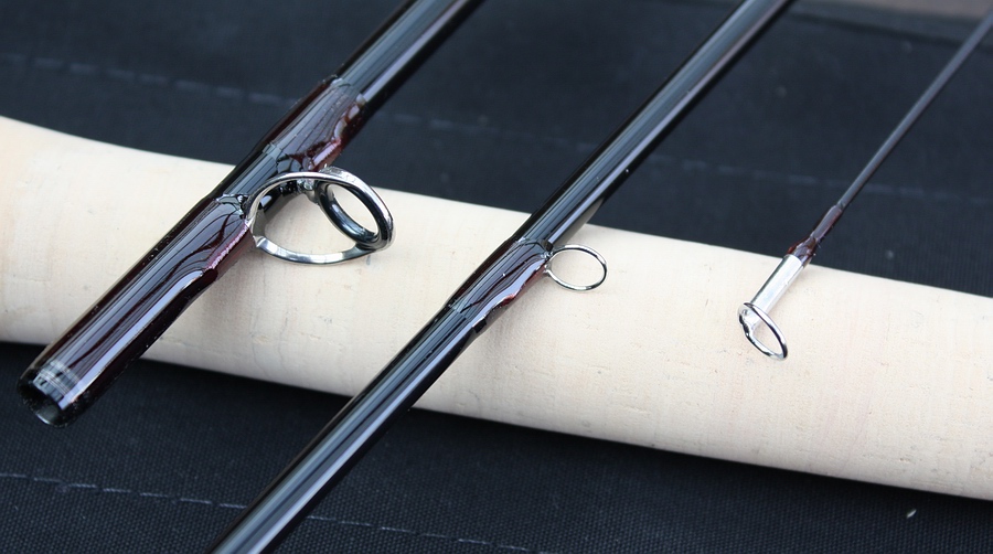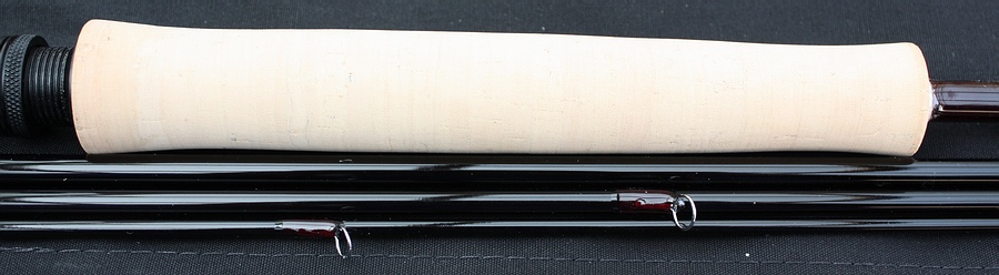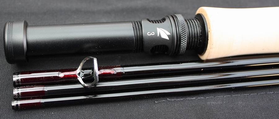 Teilung und Maße: Vierteilige Fliegenrute, Länge 10'0" (zusammengesteckt und nachgemessen 304,5 cm), vier bis auf wenige Millimeter gleichlange Teile um 80 cm. Das Gewicht der Rute beträgt 74 Gramm. Blankdurchmesser über dem Griff: 8,5 mm, Blankdurchmesser an der Rutenspitze: 1,4 mm. Länge Transportrohr: 83,5 cm, Gewicht Transportrohr (leer): 409 Gramm. Ausstattung: Schlanker, schwarzer, glanzlackierter Blank aus hochmodulierter Kohlefaser (KonneticHD Technologie). Die Verbindungen der Einzelteile wurden als exakt passende Überschubverbindungen ausgeführt, die oberen Enden der Ruteneinzelteile wurden gegen das Eindringen von Schmutz und Wasser abgedichtet. Beringung: Handteil ohne Beringung und ohne Fliegeneinhängeöse, zweites Teil mit einem gefütterten Fuji Dreibein-Leitring und zwei Einstegringen, drittes Teil mit drei Einstegringen, Spitzenteil mit fünf Einstegringen und dem Spitzenring. Alle Ringe besitzen der Schnurklasse angemessene Durchmesser und Materialstärken, sie wurden hartverchromt und weisen die nötigen Abstufungen auf. Die Ring- und Zierbindungen wurden in tief Dunkelrot und Halbtransparent ausgeführt, an den Übergängen der Einzelteile und am Handteil gibt es zudem Zierwicklungen in Metallic-Grau. Alle Bindungen wurden sauber (reichlich) lackiert und gründlich versiegelt. |