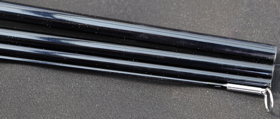 Teilung und Maße: Vierteilige Fliegenrute, Länge 9'0" (zusammengesteckt und nachgemessen 274 cm), vier gleichlange Teile a. 73 cm. Das Gewicht der Rute beträgt 143 Gramm. Blankdurchmesser über dem Griff: 10,7 mm, Blankdurchmesser an der Rutenspitze: 2,0 mm. Länge Transportrohr: 76 cm, Gewicht Transportrohr (leer): 450 Gramm. Ausstattung: Schwarzblauer (Squid Ink) glanzlackierter Blank aus hochmodulierter Kohlefaser (KonneticHD Technologie). Die Verbindungen der Einzelteile wurden als exakt gearbeitete Überschubverbindungen ausgeführt. Die oberen Enden der Einzelteile wurden gegen das Eindringen von Schmutz, Nässe etc. abgedichtet. Beringung: Übergroße Fuji Keramik Führungsringe und super-hartverchromte Schlangen- und Spitzenringe. Handteil ohne jegliche Beringung, zweites Teil mit zwei gefütterten, abgestuften Fuji Keramik Dreibein-Leitringen, drittes Teil mit drei abgestuften Schlangenringen, Spitzenteil mit vier Schlangenringen und dem Spitzenring. Alle Ringe besitzen der Schnurklasse angemessene Durchmesser und Materialstärken, bzw. sind "Over Sized" und wurden mehrfach abgestuft. Die Ring- und Zierbindungen wurden in Schwarz ausgeführt, außerdem gibt es metallic-blaue Zierbindungen am Handteil und an den unteren Enden der Einzelteile. Alle Bindungen wurden sauber bis reichlich lackiert und gründlich versiegelt. Griff: Full Wells Korkgriff, 17,7 cm lang, aus 6 mm starken Korkscheiben in erstklassiger Qualität. Am unteren Rutenende befindet sich ein kleiner, 51 mm kurzer Fighting Butt mit verbreitertem Moosgummiabschluss unten. Rollenhalter: Solider, salzwasserfester Alu-Schraubrollenhalter und Spacer, schwarz anodisiert, mit beweglichem, massivem Schubring und Doppelmutter-Technik, griffwärts wirksam und leichtgängig. Gesamtschraubweg 43 mm. Aussparungen für das Einhängen der Fliege, beidseitig. Zusätzliche Lasergravur der Schnurklasse auf dem Rollenhaltering. Sonstiges: Die Lieferung erfolgt im schwarzen Rutenfutteral mit Logo und im blauen, pulverbeschichtetem Aluminium-Rutenrohr mit SAGE Medaille. Rutenpreis: 950,00 € (Rohling: 525,00 €) 30-jährige SAGE Garantie für den Erstbesitzer (alles Stand Mai 2018) |