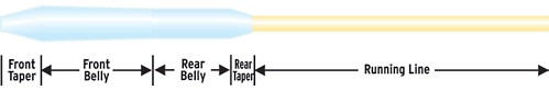 | Art / Aufbau: | Ab Spitze (mit 1,06 mm Durchmesser) nimmt der Schnurdurchmesser auf den ersten gut 2 m rasch bis auf 1,63 mm zu, bleibt dann auf 2 m bei dieser Stärke, verjüngt sich nun über 3 m auf 1,50 mm und bleibt auf weiteren 6 m bei diesem Durchmesser. Anschließend folgt auf 1,5 m ein kurzes Rear-Taper sowie schließlich die 16,9 m lange Runningline (mit 1,01 mm Durchmesser). Die Schnurdurchmesser passen gut zur Schnurklasse #9. "SAID"-Schnurtypen- und Klassenbeschriftung im Spitzenbereich. |