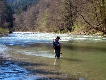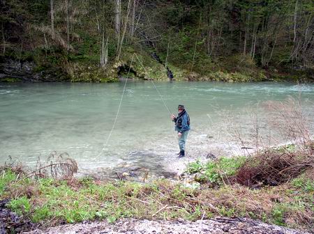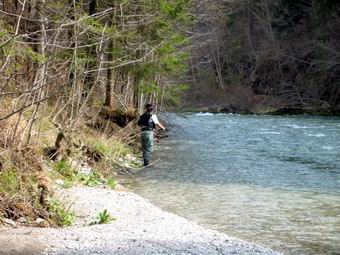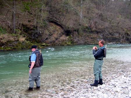 Zurück zur Savinja. Da am ersten Tag das Wasser noch recht hoch und von der Schneeschmelze getrübt war, waren meine Versuche mit der Trockenfliege wenig erfolgreich. Unter der Anleitung unseres Guides Michael wurde die Rute fürs Fischen mit der Nymphe umgerüstet und mir kurz die Grundbegriffe des Nymphenfisches erläutert. Meine fehlende Erfahrung versuchte ich mit viel Eifer und Geduld auszugleichen. Um mich bei meinen ersten Versuchen mit der Nymphe nicht allzu blamieren zog ich mich Flussaufwärts zurück. |