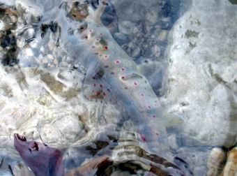 | Rasant zog die Forelle nun Stromab in die harte Strömung, mein Mittelfinger besaß nun einen roten Querstreifen, genau so breit wie meine Flugschnur, aber der Fisch wird langsamer und ließ sich mit Glück auch kurz darauf am Ufer landen. Ich war stolz wie Oskar meine erste Bachforelle von 56,5 cm in den nassen Händen halten zu können, vor lauter Aufregung hatte ich nicht bemerkt, das mein Vater und unser Freund Mark, den ganzen Drill verfolgt und einige Bilder dabei geschossen haben. |