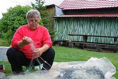 | In den etwas feinmaschigeren Netzen hängen zahlreiche Cypriniden, die auch von zu Hause bekannt sind. Es handelt sich um die paläarktisch verbreiteten Arten Rotauge (Rutilus rutilus), Nerfling (Leuciscus idus) sowie das Baikal-Hasel (Leuciscus baicalensis). Die Cyprinidenfauna des Baikal ist recht artenarm, zusätzlich kommen nur Brachse, Elritze, Gründling, Giebel und Schleie vor. Die gefangenen „Weißfische“ hängt Wassily zum Trocknen in ein mit Gaze überspanntes Gerüst. |