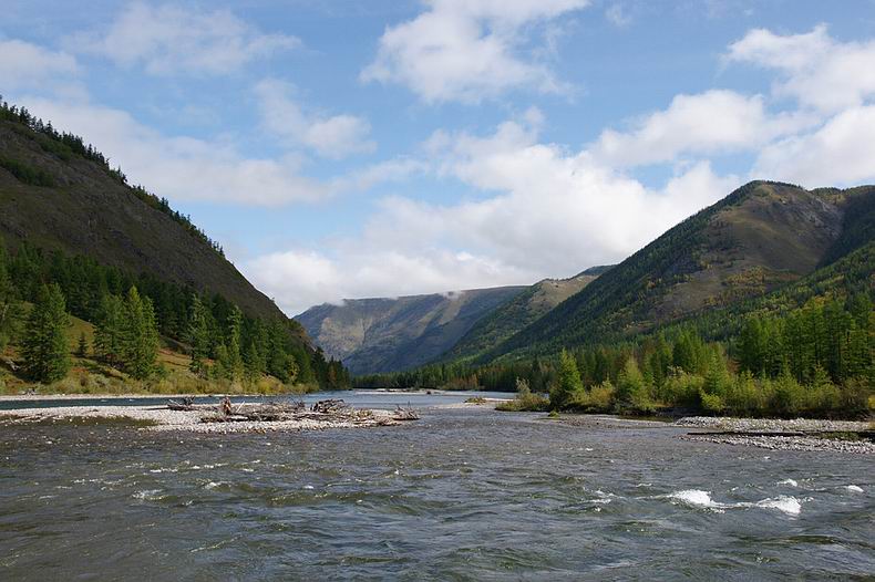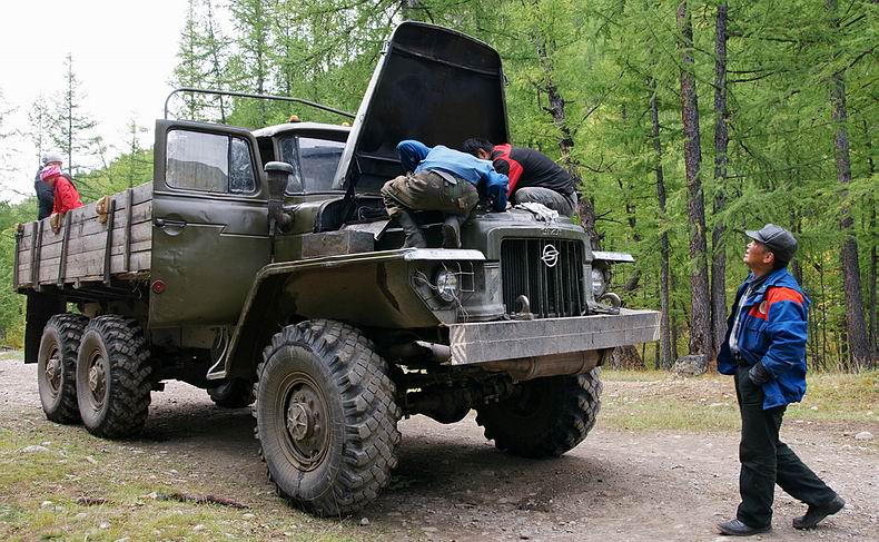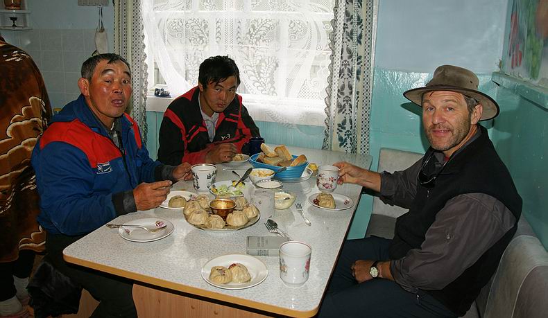 Zurück in Irkutsk treffen wir den Pensionisten Aleksej, der uns weiter bis ins Sayangebirge begleiten wird. Er gehört dem buryatischen Volksstamm an, der eng mit den Mongolen verwandten Bevölkerung der Gegend um den Baikal. Zuerst legen wir 400 km Straße von Irkutsk über Sljudjanka am Südende des Sees, das Tunka-Tal mit breiten Wiesen und Dörfern typischer buryatischer Holzhäuser bis an den Rand des Gebirges zurück, wo schneebedeckte 3000er und das rauschende, glasklare Wasser des Irkut-Flusses alpines Flair verbreiten. Direkt vor der mongolischen Grenze folgen wir einer nach West abzweigenden Schotterpiste und über unbesiedelte Hochtäler und Pässe überqueren wir die Wasserscheide zum Oka-Fluss, bis wir im letzen Ort im Gebirge ankommen – Orlik. Gastfreundlich, wie die Buryaten sind, werden wir hier von Aleksejs Familie mit einem Willkommens-Ritus empfangen, bei dem eine Schale Milch getrunken und ein (unpolitisch) blauer Schal überreicht wird. In der Nacht werden wir mehrmals von Lärm im Hof geweckt. Am Morgen folgt die nächste Aufregung: Aleksej sorgt sich, ob unsere draußen verstauten Vorräte noch vollständig sind. Wir überprüfen das und finden alles vor, nur ein Laib Brot ist abhanden gekommen. Scharfsinnig schließt der Buryate erleichtert, beim nächtlichen Störenfried müsse es sich um einen Hund und keinen Zweibeiner gehandelt haben, weil der Wodka noch da ist, das Brot aber fehlt. Hinter dem Holzhaus können wir bereits das monströse Gefährt bewundern, mit dem die Reise am nächsten Tag weiter geht: Es handelt sich um einen alten, dreiachsigen LKW mit groben, gut einen Meter hohen Stollenreifen. Verbrauch: 100 Liter auf 100 Kilometer! Dass der Einsatz dieses wilden Fahrzeugs mehr als angebracht ist, zeigt sich, als wir gleich am Anfang die Oka auf einer hundert Meter breiten und über weite Strecken mehr als einen Meter tiefen Furt durchqueren. Weiter führt die Route den ganzen Tag das Tal des Tissa-Flusses stromauf, wobei großteils das Flussbett als „Strasse“ benutzt wird, um dichtem Wald oder Sumpf auszuweichen. Vereinzelt liegen hier auf 1400 m Seehöhe noch Gehöfte, die – ähnlich wie die heimischen Almen – im Sommer zur Rinderzucht bezogen werden. Viele Stunden später erreichen wir die letzte menschliche Ansiedlung: Der hier mit seiner Familie lebende Buryate Zseseren wird uns mit seinen Pferden bis zum Ausgangspunkt unserer Bootstour über die Berge begleiten, wofür drei Tage veranschlagt sind. Der LKW-Fahrer bringt uns noch zwei Fahrstunden weiter stromauf, wo wir beim Ausfluss des wunderschönen Gebirgssees Schuchtalai Nuur übernachten. |