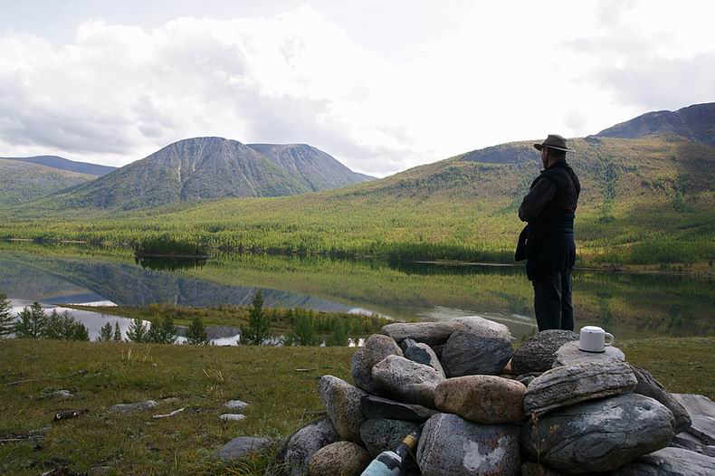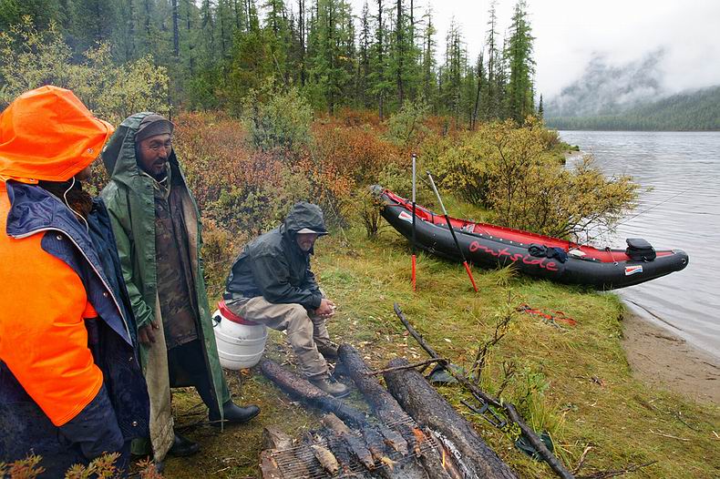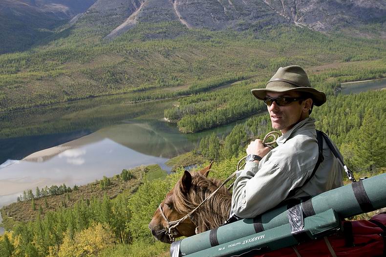 Am Abend kommen Aleksej und Zseseren zu Pferd nach, leider nur mit vier Gäulen. Wir sind skeptisch, ob diese vier Reiter samt Boot, Gepäck und Proviant für drei Wochen über die Berge tragen können. Doch keine extra Tragpferde zu verwenden, erweist sich als richtige Entscheidung: Die Reitstrecke entpuppt sich als Hindernis-Parcours par excellence. Dichtes Gestrüpp, eng stehende Baumstämme, zahllose steile Böschungen und tiefe Furten sowie lange sumpfige Abschnitte behindern das Vorwärtskommen und hätten beim Nachführen von Packpferden große Probleme bereitet. Den ersten Reittag erleben wir als Leistungsschau der buryatischen Pferde: Die frischen Tiere halten in gestrecktem Marsch bis zur Finsternis durch, sodass wir mehr als die Hälfte der Strecke bereits am ersten Tag schaffen. Die Landschaft hier im Hochgebirge erweist sich trotz des schlechten Wetters als märchenhaft schön, zwischen den Wolken blinzeln weiße Gipfel (z.B. der nahe Munku Sardik mit 3491 m) durch. Wir reiten zuerst durch Nadelwald, teils flussbegleitende Moore und lichte Lärchen bis hinauf in die hochalpine Tundra, wo rot verfärbte Zwergbirken, vereinzelte Zirben und sich flächig ausbreitende Rentierflechten wunderschöne Farbkontraste bilden. |