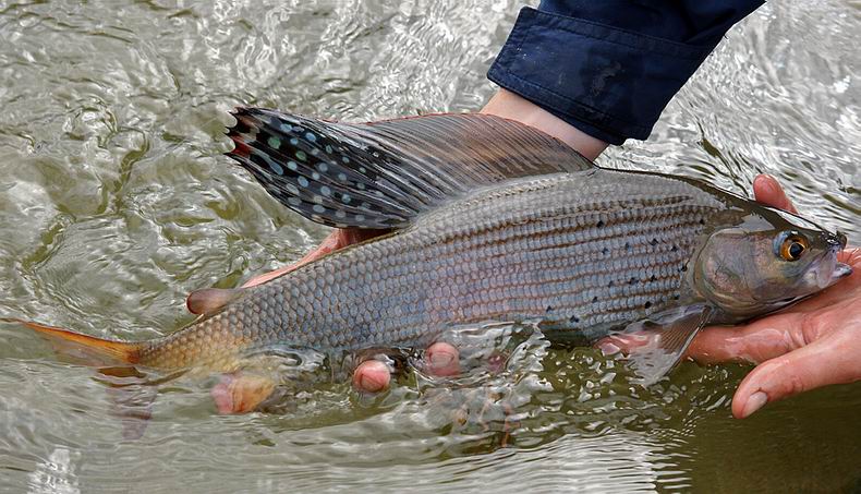 Und tatsächlich, bei den Äschen hier im Belin Chol handelt es sich unzweifelhaft um diese wunderschöne, neue Art. Nicht nur der goldgelbe Schwanzstiel, auch weitere Merkmale wie die „bulligen“ Proportionen (große Höhe von Kopf und Rumpf im Verhältnis zur Körperlänge) oder die Zahl von mehr als 5 Fleckenreihen auf der Rückenflosse unterscheiden die „Gelbschwanzäsche“ von anderen Formen. |