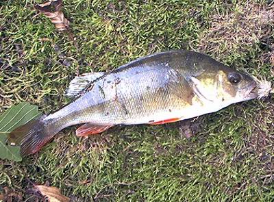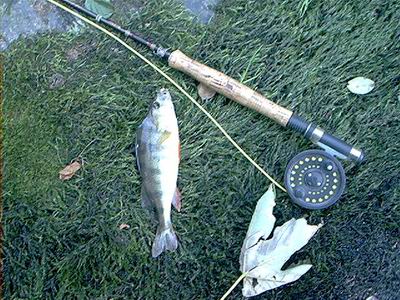 | Ungewohntes, gras-grünes Wasser ließen meine Erwartungen gegen "0" steigen, aber ich wollte es nicht unversucht lassen. Mir standen für diesen Tag 1,3 km Strecke zur Verfügung und für € 6,- war ja nichts verloren. Steigverhalten war keins zu sehen und aufgrund der Trübung entschied ich mich für einen Cone-Head-Rehhaar-Koppenstreamer. Ich war sehr überrascht, als sich nach einigen Würfen tatsächlich ein beißwilliger Fisch an der Rute bemerkbar machte, jedoch hat er sich auch gleich wieder verabschiedet. Kurz darauf wieder ein Biss und ein etwa handlanger Barsch verlässt kurzzeitig zum Fototermin das Wasser. | ![]() |