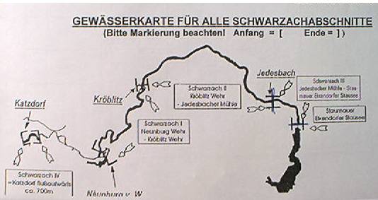 Preis: € 6,- für Schwarzach III (1,3 km wobei dabei 1 km Fliegenfischerstrecke ist) Gewässerkarte: