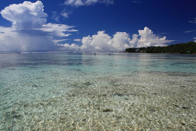 Bekleidung: Die tropische Äquatorsonne brennt meist unbarmherzig intensiv, hinzu kommt beim Waten im Flat die Reflexion von Wasseroberfläche und hellem Korallensand. Das heißt, der Angler bekommt stets die volle Breitseite an Strahlung aus allen Richtungen ab. Und: die Strahlung ist auch bei geschlossener Wolkendecke da! Dagegen hilft geeignete Funktionsbekleidung mit integriertem UV-Schutz, z.B. die leichten Pants (oder Shorts) und Bimini/Flat-Caps von Patagonia, Simms oder vergleichbares, dazu leichte Tropen-Oberhemden, UV-Buff‘s für den Hals- und Kopfbereich, eine hochwertige Pol-Brille, leichte Handschuhe und keinesfalls zu vergessen: ein wasserfestes, hoch wirksames Langzeit-Sonnenschutz- mittel für alle Stellen, die der Sonne ausgesetzt sind (auch die Naseninnenseiten – hier kann man sich tatsächlich einen Sonnenbrand holen!!!). Dafür empfehlen sich für Wassersportler entwickelte, nicht fettende Gel‘s wie z.B. ausgezeichnete Produkte des australischen Herstellers Yarray (in D nur schwer zu bekommen, leider), oder das amerikanische Bullfrog (zu beziehen z.B. über Amazon, USA) u.w.. Ein Paar gute Flat-Watschuhe wie z.B. die Flat Sneaker von Simms machen das Wat-Vergnügen perfekt. An den Schuhen sollte man keinesfalls sparen, denn Verletzungen durch Korallen oder Seeigel fallen nicht mehr in die Kategorie "Urlaubs-Spaß"! | ![]() |