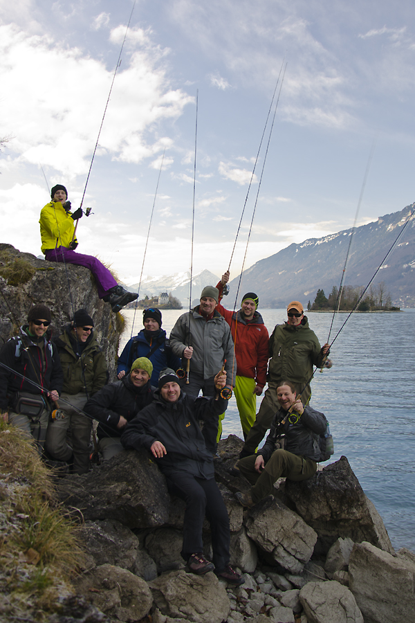 Bereits ab Donnerstag füllten sich die Gästezimmer des Hotels Urweider (www.urweider.ch) sowie weiterer Gasthäuser in Innertkirchen und beim gemeinschaftlichen Warmwerfen am Freitagabend zeigte sich die starke Motivation der Gruppe. Samstag Früh (Eröffnungstag) wurde schleunigst der Schlaf aus den Augen gerieben und auf ging’s zu den Ufern des wunderbaren Brienzersees. Der Startschuss ertönte nahe der Ortschaft Iseltwald auf der einsamen Südseite des Gewässers – der See belohnte uns mit seinem glasklaren Wasser und dem gigantischen Bergpanorama. Auch Petrus war in doppelter Hinsicht gut aufgelegt, denn wir erhielten nicht nur Sonnenschein sondern auch aktive Fische! Tatsächlich war es ein höchst ungewöhnliches Seeforellen-Opening: Temperaturen über Null Grad, weder Schnee noch Sturm, und bereits nach 1 Stunde der ersehnte Fangerfolg! Nach vorangehenden Attacken bei den Brüdern Frank und Uwe Müller war es schließlich Matthias Meyers Streamer, an dem eine junge Seekönigin hängen blieb – begleitet von einem Jubelschrei, der vermutlich noch am gegenüberliegenden Seeufer zu hören war. Auch wenn die 25er das Schonmaß „knapp“ verfehlte, so blitzte sie doch wie ein herrlicher Edelstein. Hochmotivierte Seeforellenfischer(in) an den Ufern des Brienzersees (ab) |