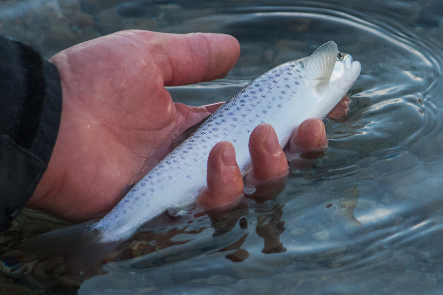 – Eine junge Seeforelle wird behutsam zurückgesetzt (um)