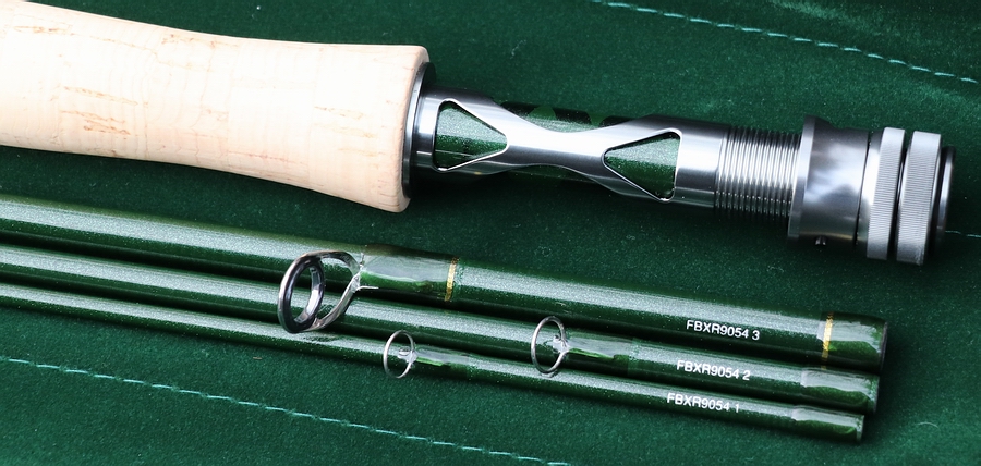 Die FBXR9054 ist optisch sehr gelungen, die schlanke und leichte Rute harmoniert in ihren dunklen grünen Farbtönen, den transparenten Bindungen, dem stylischen Rollenhalter und dem feinen Korkgriff sehr gut! An Blank, Beringung, Lackierung und gesamter Ausstattung und Verarbeitung gibt unsererseits es nichts zu bemängeln. Alle Ringe sitzen gerade und in der Flucht, die Ring- und Zierbindungen wurden sauber lackiert und gründlich versiegelt. Der Korkgriff kommt in guter Qualität, er wurde mit einer synthetischen Spezialbeschichtung versehen und fühlt sich glatt und rutschsicher an. Die Beschichtung schützt den Griff außerdem vor Nässe und Schmutz, bzw. verhindert ein Festsetzen desselben daran. Der Griff liegt gut in der Hand und passt mit seinen Dimensionen gut zur Rute. Eine schöne Sache ist der innovative und sehr leichte Schraubrollenhalter nebst Käfig, in dessen Ausfräsungen man nach "X-Men" Manier den grünen Kohlefaser-Spacer sieht. Der Rollenhalter besitzt eine zweite Mutter und erfüllt seine Aufgabe sehr sicher und zuverlässig. Zusammengesteckt wird die FBXR9054 mit sehr gut passenden Überschubverbindungen. Erleichtert wird das schnellere Ausrichten beim Zusammenstecken der einzelnen Rutenteile durch ihre Beschriftung. Die speziell an den Überschüben verstärkten Verbindungen mit ihren unlackierten "männlichen" Teilen halten die Rute besonders sicher zusammen. |