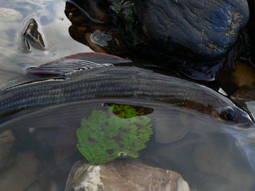| Nach dem 5. Wurf war es so weit. Wie erwartet, erschien eine unauffällige Bewegung an der Wasseroberfläche. Es erfolgte ein sanfter Anhieb und sie war dran. Anfangs hat sie mich richtig verwirrt. Anstatt heftigen Ziehen tauchte sie mit der Schnur tief und verschwand in der Strömung. Vorher schaffte ich aber, ihre wunderschöne, sehr große Rückenflosse zu bemerken und wusste, dass es ein Milchner sei, dessen Rückenflosse größer als diejenige des Weibchens ist. Übrigens: diese nur bei den Äschen vorkommenden einzigartigen Rückenflossen brachten der Äsche den Spitznamen Fahnenträgerin ein. Als ich versuchte, den Fisch Richtung Ufer zu ziehen, fing der Kampf an. Unerwartet sprangt sie hoch in die Luft und stellte sich danach quer zu Strömung. Nachlassen der Schnur löste das Problem aber schnell, nach ca.5 Minuten landete ich sie, machte ein paar Schnappschüsse und schenkte ihr die Freiheit wieder. | ![]() |