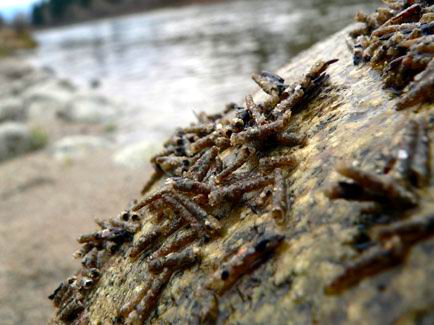 die Köcherfliegen bereits zu hunderten fast unter jedem größeren