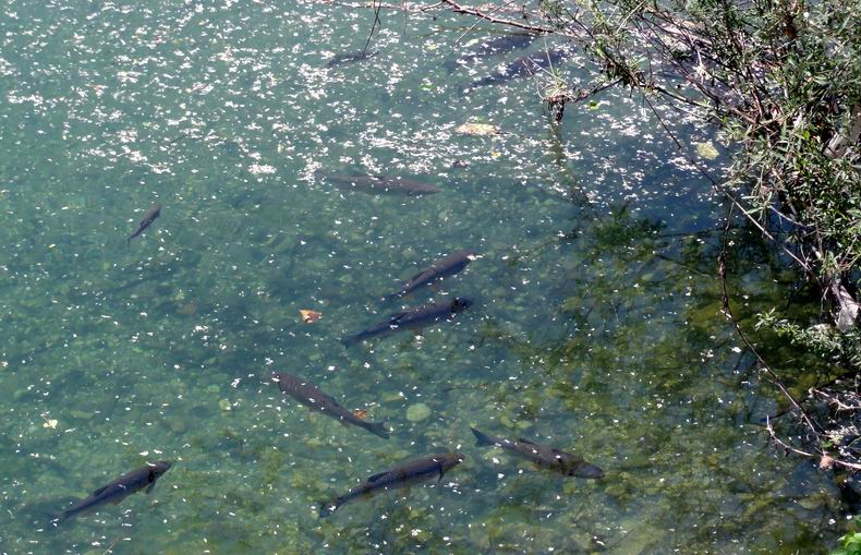 | Döbel-Versammlung in der Idrijca | Unten: Im Wasser hat es nicht nur Fische... |