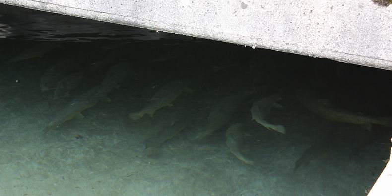 | Bei unserem Besuch im riesigen Bruthaus in Most na Soci, welcher bei allen Teilnehmern einen tiefen Eindruck hinterließ, konnten wir uns ein Bild machen vom enormen Umfang der eigenen Fischaufzuchtprojekte des Vereins. In diversen Behältern schwammen u.a. große Mengen an Äschen und Marmoratas in verschiedenen Stadien. Sechs ständige Mitarbeiter sowie immer wieder Studenten, Praktikanten und Kollegen aus aller Welt sind in der Anlage Vollzeit- beschäftigt, sowie im Außeneinsatz aktiv. Natürlich besuchten wir auch die dazu gehörende Fischzuchtanlage in Tolmin. Hier in der vom reinen, kalten Wasser der Tolminka durchströmten, überdachten Anlage leben z.B. die Marmorata- Laichfischbestände (man kann Marmoratas bis 11 Kilogramm bestaunen...) und andere Fische in den älteren Stadien. Beim Beobachten dieser Fische wird auch wieder einmal deutlich, wie lichtscheu diese Nachjäger eigentlich sind... Also definitiv keine „Sportfische“ für die erholsame und leichte Fliegenfischerei bei Tageslicht! (Ausnahmen bestätigen bekanntlich die Regel: so wurde nur eine Woche nach unserer Abreise in der Baca bei etwas erhöhten und regentrüben Wasser eine Marmorata mit 15 Kilogramm gefangen...) | ![]() |